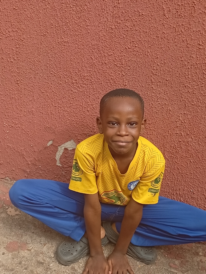 A young, dark-skinned boy with a shaved head sits on the ground, legs spread wide, wearing a yellow shirt with a green logo and blue pants. He has a slight smile and is looking directly at the camera. He wears dark gray slip-on shoes. The background is a textured red wall with a patch of discoloration on the left side. The ground is concrete or stone.