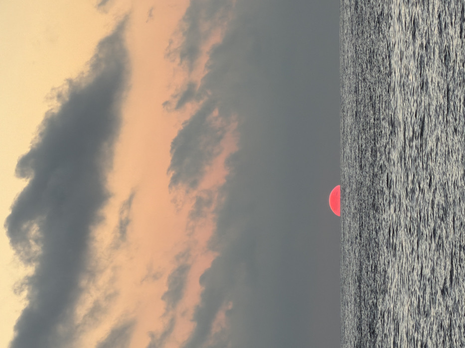 The image depicts a sunset over water. The sky is filled with dark, grey clouds against a peach-colored backdrop. The sun is a vibrant red half-circle dipping towards the horizon, which meets a textured body of water, its surface appearing rough and choppy. The scene presents a stark contrast between the calm sunset colors and the turbulent water.