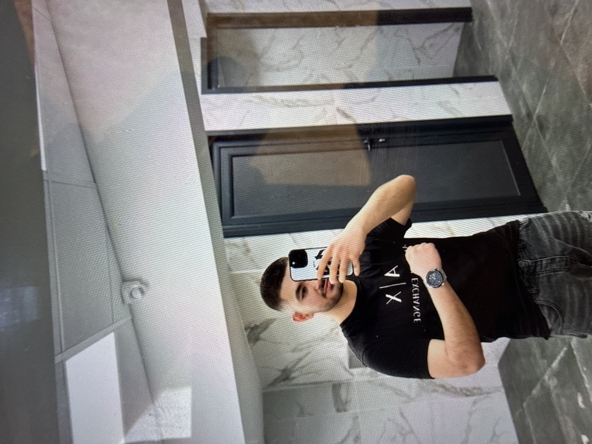 A man with dark hair and a beard is taking a selfie in a bathroom. He is wearing a black t-shirt with white lettering and a watch on his left wrist. He is holding a smartphone in his right hand. The bathroom has gray and white marble tiles on the walls and floor. There is a black-framed window in the background. The location is Zlataritsa, Bulgaria.