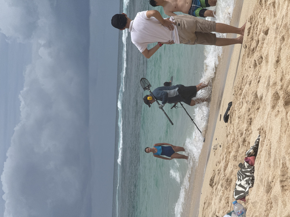 - "On a beach, a man in a white shirt and tan shorts stands near the water's edge, while another man with headphones uses a metal detector in the shallows" by FM-gfWXg2, licensed under CC BY 4.0