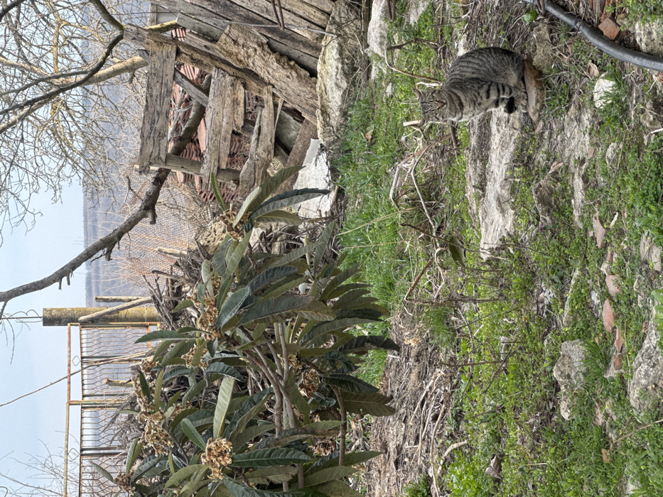 The scene, located in Rabrovo, Bulgaria, depicts an outdoor area, likely a garden or yard, under an overcast sky. In the immediate foreground, a tabby cat, exhibiting gray and black striped fur, sits upright on a light-colored flat stone, its tail curled. The cat faces directly towards the viewer with an alert expression. The ground surrounding the cat is covered with sparse green grass, weeds, scattered rocks, and fragments of red terracotta tiles. A dark hose or pipe runs along the bottom right edge. Midground elements include a prominent shrub or small tree, identified as a loquat, featuring broad, dark green leaves and clusters of light brown, dried flowers or developing fruit. Behind this foliage, a heap of debris is visible, comprising various pieces of weathered wood, including what appears to be a broken wooden chair frame or similar structure, interspersed with numerous reddish-brown terracotta roof tiles. Dry branches and tangled vegetation contribute to the cluttered appearance. In the background, a rusted metal fence or gate with decorative scrollwork is visible, supported by a concrete pillar on the left. Beyond the fence, a distant landscape of low hills or forested terrain extends under a pale blue-grey sky. Bare tree branches from deciduous trees frame parts of the upper background.