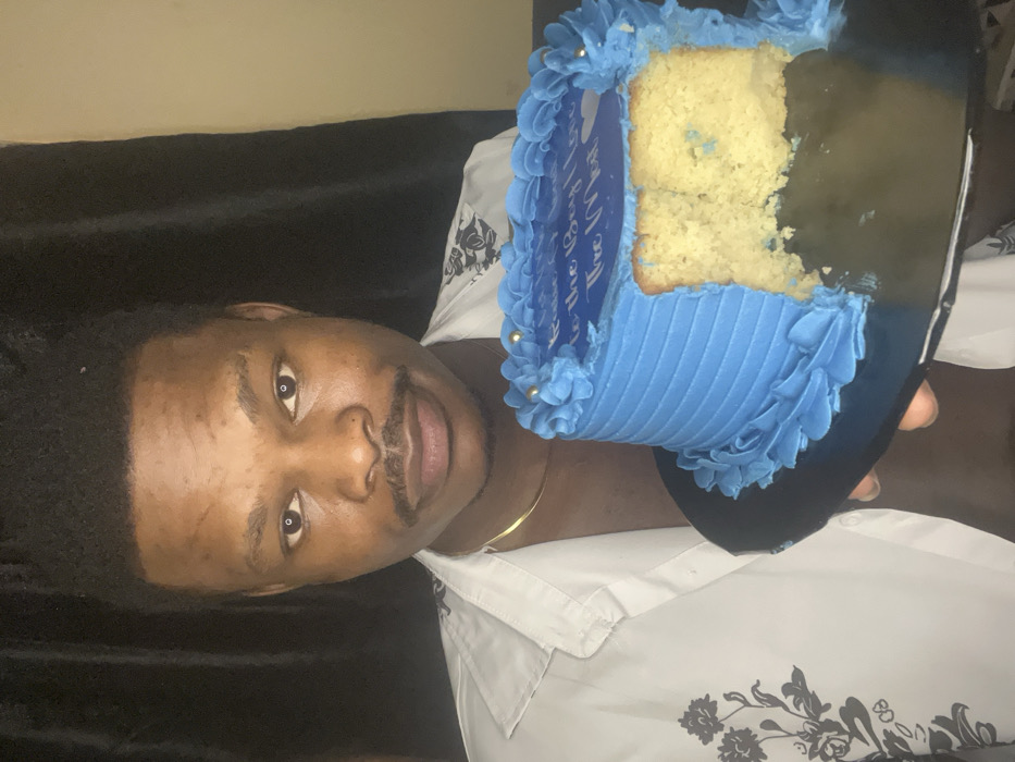 An indoor photograph taken in Rafin Par, Nigeria, features a young adult male holding a partially-eaten round cake
