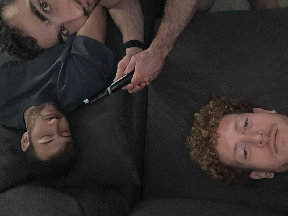 The image displays three adult males within an indoor setting, likely a residential space, characterized by a dark gray upholstered surface, possibly a sofa. In the upper left, one male is lying on his right side, eyes closed, appearing to be asleep or unconscious. He has short, dark brown hair and light facial hair, wearing a dark blue-gray short-sleeved shirt. To the right, a second male is partially visible, holding a black electric toothbrush with a light blue-white head in both hands, angled towards the sleeping individual's head. This person has dark, curly hair, prominent eyebrows, a beard, and wears a dark top. A dark wristband is visible on his left wrist. His gaze is directed towards the camera. At the bottom of the frame, the head and upper chest of a third male are visible. He has light brown, curly hair and light facial stubble, with his eyes open and directed towards the camera. The background consists uniformly of the dark gray upholstered material. There are no distinguishing features or landmarks visible that would allow for the identification of a specific location within Be’er-Sheva, Israel.