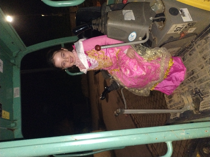 A girl in a pink dress with gold trim is sitting in the cabin of a piece of machinery