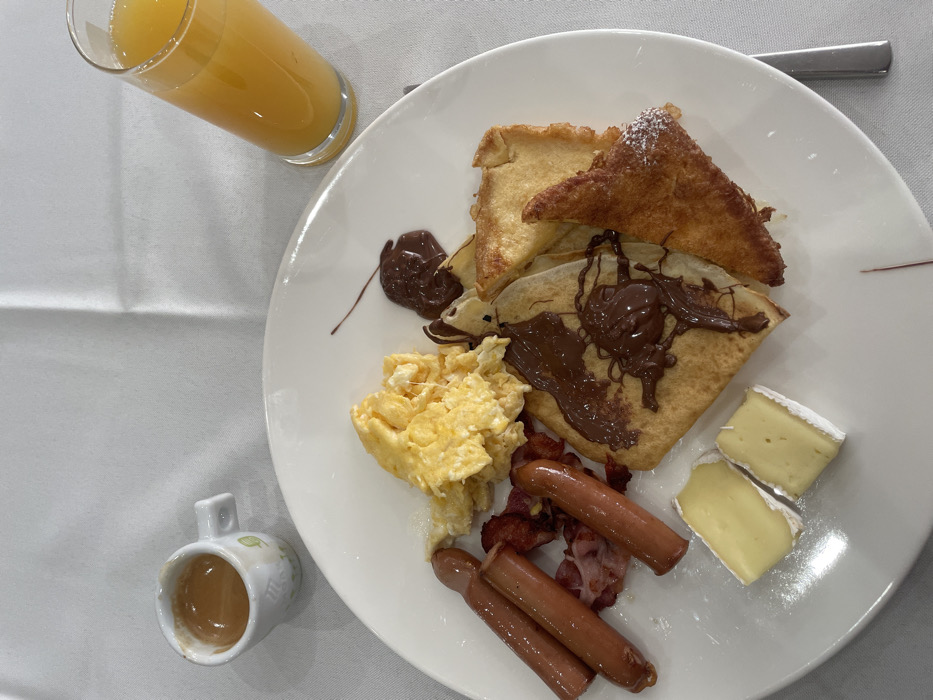 A breakfast meal is displayed on a white tablecloth in Kladnitsa, Bulgaria. A large white oval plate occupies the center, laden with various food items. On the left side of the plate are three reddish-brown cooked sausages, a portion of yellow scrambled eggs, several pieces of crispy cooked bacon, and two wedge-shaped portions of soft cheese with white rinds. On the right side of the plate are two folded crepes or pancakes heavily drizzled with melted chocolate or a similar dark spread, alongside multiple pieces of golden-brown fried dough, possibly French toast, some lightly dusted with a white powder. A small streak of chocolate sauce is also present on the plate's white surface. To the upper left of the plate, a small white ceramic espresso cup with a subtle green leaf design contains a light brown liquid, presumed to be espresso. To the upper right, a clear glass holds an orange-colored liquid, consistent with orange juice. A silver-colored utensil handle is partially visible on the bottom right edge of the frame, adjacent to the plate. The white tablecloth exhibits visible folds and creases. No individuals are present in the image.