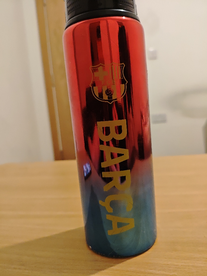 A metallic cylindrical water bottle stands upright on a light-colored wooden surface. The bottle exhibits a gradient color scheme, transitioning from glossy red at the top to a shimmery blue-teal at the bottom. A golden FC Barcelona crest is positioned centrally on the upper red section, with the word "BARÇA" printed vertically in golden capital letters below it, extending into the blue-teal portion. A black, textured cap is fitted at the top. The bottle displays multiple vertical scratch marks across its surface. The background features a blurred, light-colored wooden element, possibly a door frame or chair back, on the left, and a plain, light-colored wall on the right, which includes a faint, out-of-focus white rectangular object, likely an electrical outlet. The indoor setting provides no discernible features to confirm a specific location within Swindon, United Kingdom.