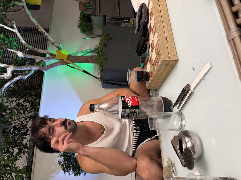 The image depicts an outdoor evening or nighttime scene on a patio or balcony in Givatayim, Israel. A male individual with dark, wavy hair, a prominent mustache, and a short beard is seated on the left. He wears a white sleeveless undershirt, dark shorts with white stripes, and a silver necklace with a rectangular pendant. He holds a hand-rolled cigarette or joint between the thumb and forefinger of his right hand, positioned near his face, and looks off to the right. A tattoo is partially visible on his left forearm. A white-topped table in the foreground holds various items: - A large, partially empty plastic bottle of Coca-Cola Zero with Hebrew text is situated in front of the man. - To its right, a clear plastic cup contains a dark beverage. - An empty clear glass tumbler is positioned to the left of the Coca-Cola bottle. - A silver, lidded ashtray with dark contents is in the bottom left. - Adjacent to the ashtray, a multi-tool or rolling device rests on a white paper strip. - In the far bottom left, a clear plastic bag contains green leafy material. - To the right of the beverages, a closed wooden backgammon or chessboard box is present. - On top of the backgammon box, a black smartphone rests on a folded black fabric item, with a smaller gray fabric item beside it. - Scattered residue, possibly ash or tobacco, is visible on the table surface. The background features a low white wall. Behind the wall, a small tree with white-painted branches and green foliage, including small fruits, grows in a dark grey planter. A yellow strap or harness is attached to the tree trunk. A green light source illuminates the wall and tree behind it. Further to the right, beyond the tree, a dark background with additional potted plants and reflections from a distant structure or vehicle is discernible.