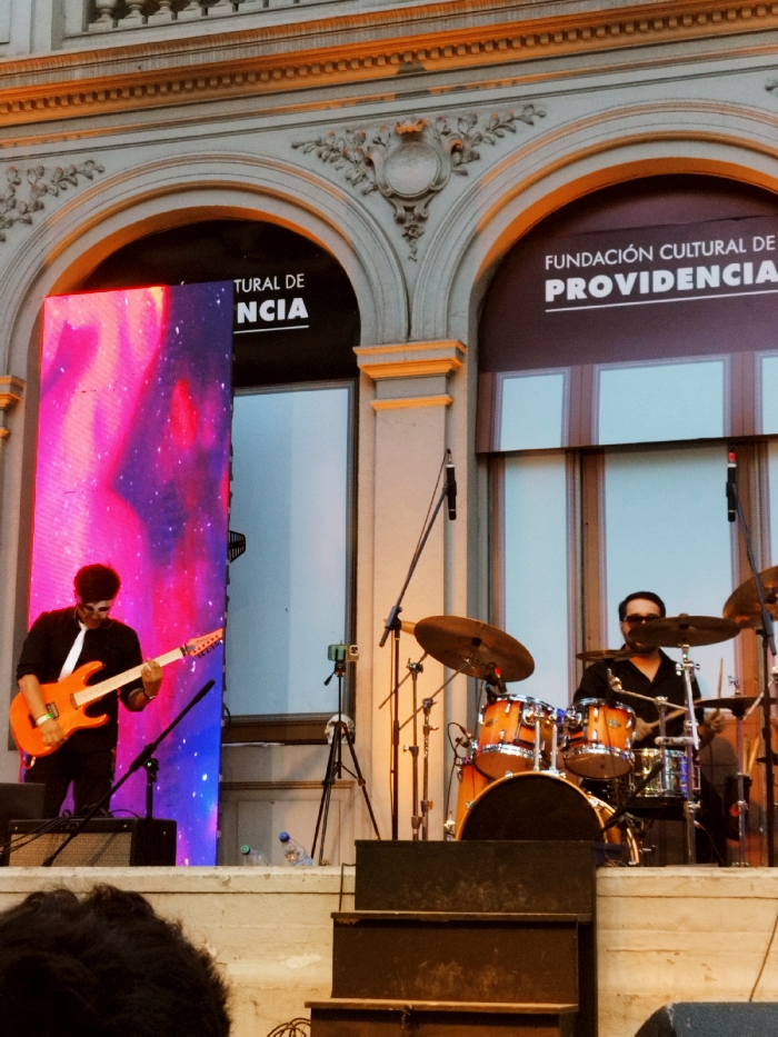 An outdoor musical performance is taking place on a raised stage in front of the Fundación Cultural de Providencia building in Providencia, Chile