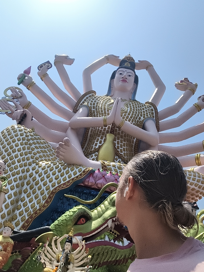 A woman with her hair pulled back stands facing a statue. The statue has multiple arms and sits atop a decorated base with a green dragon. The statue is elaborately adorned with gold and white patterns. The woman wears a pink shirt and a white earbud. The sky is blue.