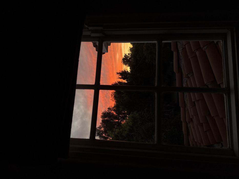 A window frames a vibrant sunset sky, divided by the window's grid. Orange and pink hues dominate the sky, with hints of gray clouds. Silhouetted trees stand against the colorful backdrop. A red-tiled roof is visible through another window pane. The room surrounding the window is dark, contrasting with the bright view. The left side of the image is almost entirely black.