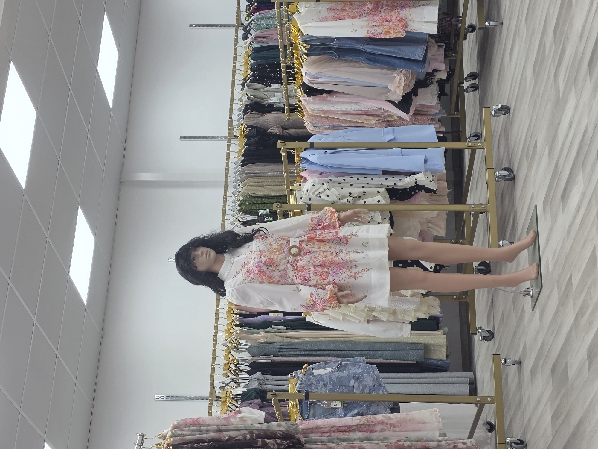 The scene depicts the interior of a retail clothing establishment in Lom, Bulgaria. A single female mannequin with dark, long hair and light skin tone stands in the foreground, facing slightly right. It is dressed in a white, high-collared, long-sleeved dress featuring a prominent pink, orange, and green floral pattern on the sleeves, upper bodice, and lower skirt, cinched at the waist by a white belt with a circular buckle. The mannequin's bare legs are visible, and it stands on a clear glass base. Multiple gold-colored metal clothing racks, equipped with wheels, are arranged throughout the store. These racks are densely populated with a wide array of women's garments, including dresses, blouses, and jackets, in various colors such as black, dark green, grey, light blue, pink, and white, displaying different textures and patterns. The walls are uniformly white. The ceiling is a white grid-patterned false ceiling, integrated with several square, recessed LED light panels providing bright, even illumination. The floor is covered with a light grey, plank-style laminate flooring. Two vertical silver-colored metal wall mounts are visible on the white back wall. No live individuals are present in the image.
