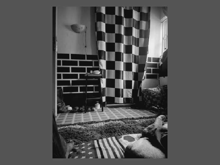 The black and white image displays an interior room located in Daxing District, China, captured from a low perspective. In the immediate foreground on the right, the lower legs and bare feet of an individual are visible, resting upon a shaggy rug, which overlays a striped fabric with a star pattern on its left side. The background features a wall with its lower section adorned by a horizontal pattern of alternating black and white rectangular brick-like panels. Above this, the wall is light-toned. A semi-circular wall sconce, exhibiting visible wiring and the Chinese characters "中心" (zhōngxīn) meaning "center," is mounted on the upper left wall. A prominent checkered curtain, composed of black and white squares, hangs to the left of a window that provides ambient light from the right side of the scene. Positioned against the patterned wall, a dark, two-tiered stand holds a white bowl containing indeterminate contents and possibly another small item on its top shelf. On the floor beneath the stand, various items of footwear, including sneakers and sandals, are arranged. A crumpled bag rests on the floor to the left of the stand. To the right of the stand, closer to the window, a patterned cushion and a dark, upholstered object are present on the floor. No active interactions are depicted.