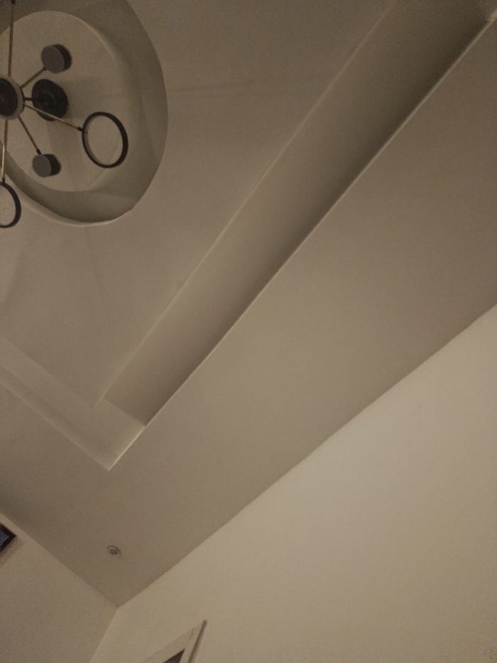 A cream-colored ceiling features a recessed rectangular section that runs diagonally across the upper right. A modern light fixture with circular elements hangs from a rounded section in the upper left. A small, round light fixture is visible in the lower left. A portion of a picture frame is visible in the bottom center, suggesting the intersection of the ceiling and wall.