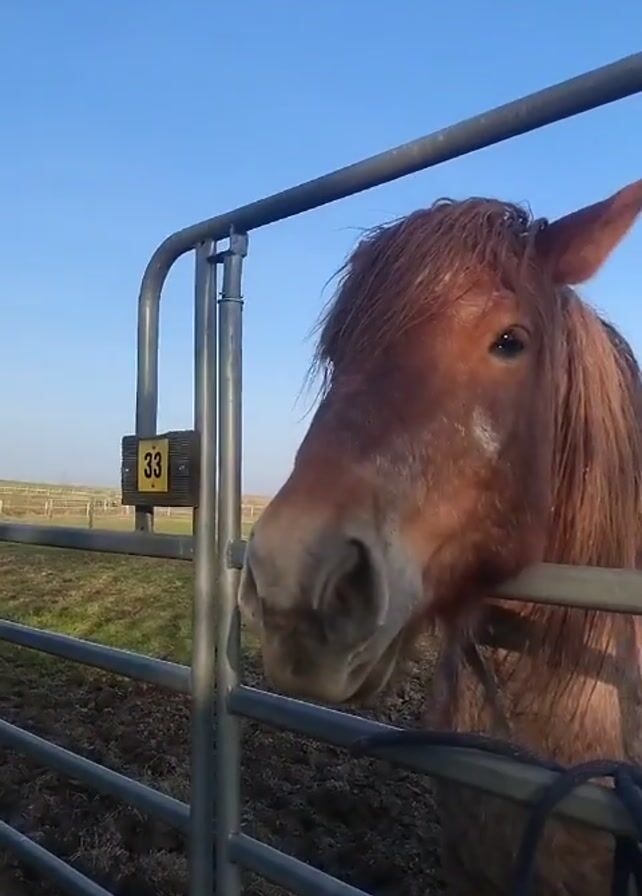 horse standing near a metal gate, numbered "33", in a field on a sunny day. The camera pans to show a brown horse, then to another gate numbered "34". Through the gates, a field with patchy grass and visible dark soil is seen, with other horses grazing in the distance. The sky is clear and blue. The overall environment suggests a rural or agricultural setting, likely a horse farm or pasture.