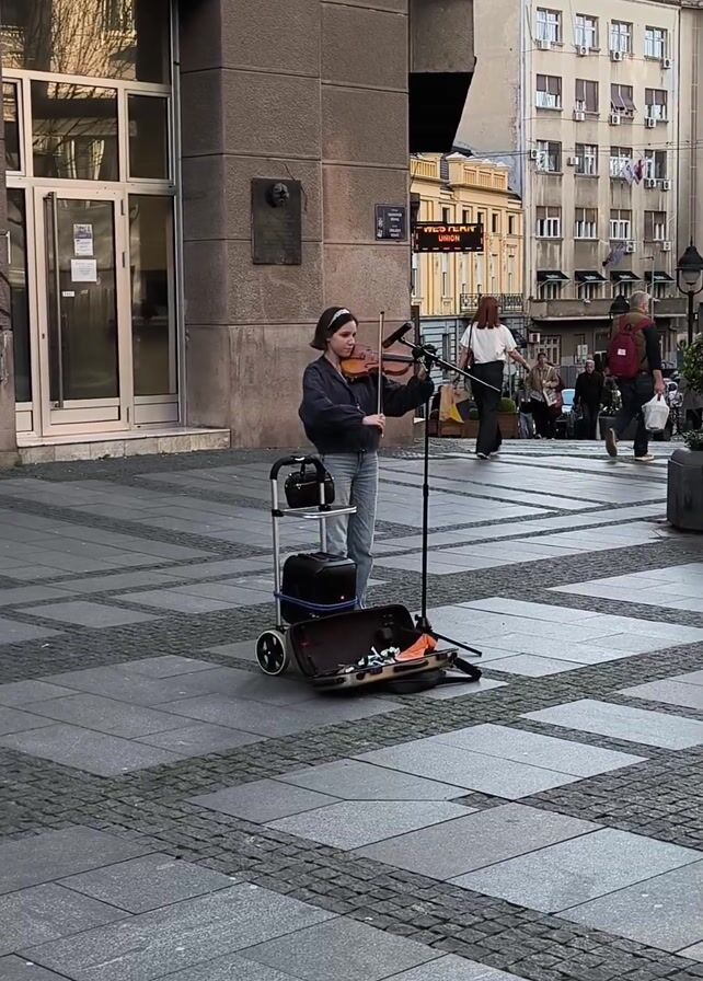 Here's a detailed description of the scene: A young woman is playing a violin on a city sidewalk. She is standing in front of a gray building with large glass windows. She is wearing a dark jacket, jeans, and a white headband. She has a microphone set up on a stand in front of her and a small cart with equipment on wheels next to her. Her violin case is open on the ground. The sidewalk is paved with gray stones arranged in a patterned design. In the background, there are other buildings, people walking, and a sign that reads "EXCHANGE OFFICE" with digital displays showing currency rates. The overall atmosphere appears to be a typical urban street scene during daylight.