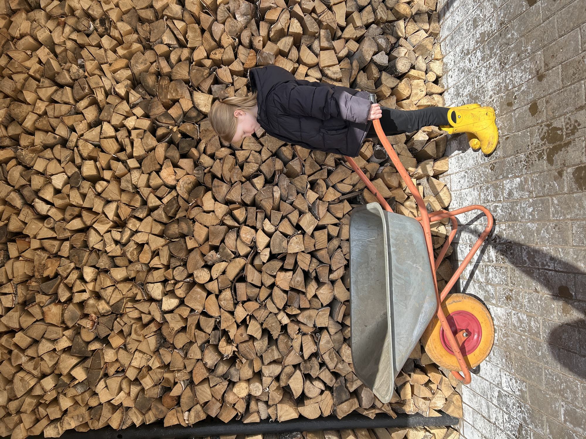 A child stands next to a wheelbarrow in Уральское, Russia. The child, wearing a black hooded jacket, black pants, and yellow Crocs, is holding the wheelbarrow's handles. The wheelbarrow has an orange frame, a grey tub, and a yellow wheel with a red center. The wheelbarrow is situated on a grey brick surface. To the left, there is a stack of cut firewood.