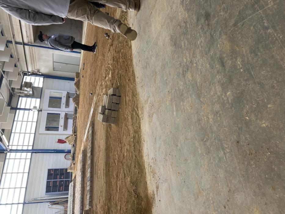The image captures an indoor pétanque court within a large, high-ceilinged industrial-style building in Montigny-lès-Metz, France. The foreground consists of a concrete floor, transitioning into a large expanse of packed earth and sand that forms the playing surface. The building's walls are constructed from white corrugated metal with visible blue vertical support beams and horizontal window sections at a higher elevation. White acoustic panels are suspended from the ceiling. On the left side of the playing area, stacked rows of grey rectangular pavers are arranged, suggesting boundary markers or targets. Several loose stacks of identical grey pavers are distributed across the sandy ground, with a prominent stack of approximately 16 blocks positioned in the mid-ground. Multiple metallic pétanque balls are visible on the court, including individual balls and a cluster of three further back. Two individuals are present: a woman stands in the mid-ground, facing left and observing the court. She wears a grey hooded sweatshirt, dark pants, and a dark baseball cap. In the immediate right foreground, the lower half of another person is visible, wearing light brown trousers and light-colored shoes, stepping away from the camera. The legs of a third person are partially discernible in the background, further to the right. The back wall features two recessed white structures with shelves below, a double door to the right, and a blue metal storage cabinet on the left. Construction materials are visible leaning against the wall on the far left. A red cylindrical object, possibly a fire extinguisher, is mounted on the back wall near the center.