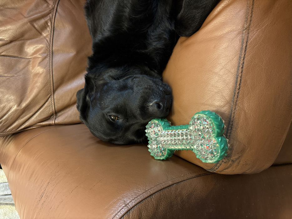 An indoor scene in Oswestry, United Kingdom, depicts a black dog resting on a brown leather sofa. The dog lies with its head on the seat cushion, its right eye partially open and visible, looking towards the viewer. Immediately adjacent to the dog's muzzle is a bone-shaped dog toy, which is translucent clear plastic with textured green ends and sides, and contains small multicolored internal inclusions. The brown leather upholstery of the sofa exhibits minor creasing and wear.