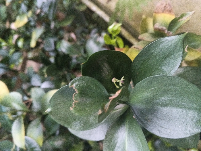 A macro photograph presents a dense cluster of glossy, dark green, ovate leaves. At the center, a delicate, pale green to yellowish structure, consistent with a nascent flower or bud, emerges from the confluence of the leaves, displaying multiple slender, irregular projections. One leaf in the upper-left quadrant exhibits a light brown, wavy discoloration along its outer margin. The background consists of out-of-focus green foliage, with several leaves showing a distinct yellowing, and an indistinct, lighter-toned surface visible towards the upper right. No human figures, animals, or specific actions are discernible. The scene is situated in Kon Tum, Vietnam.