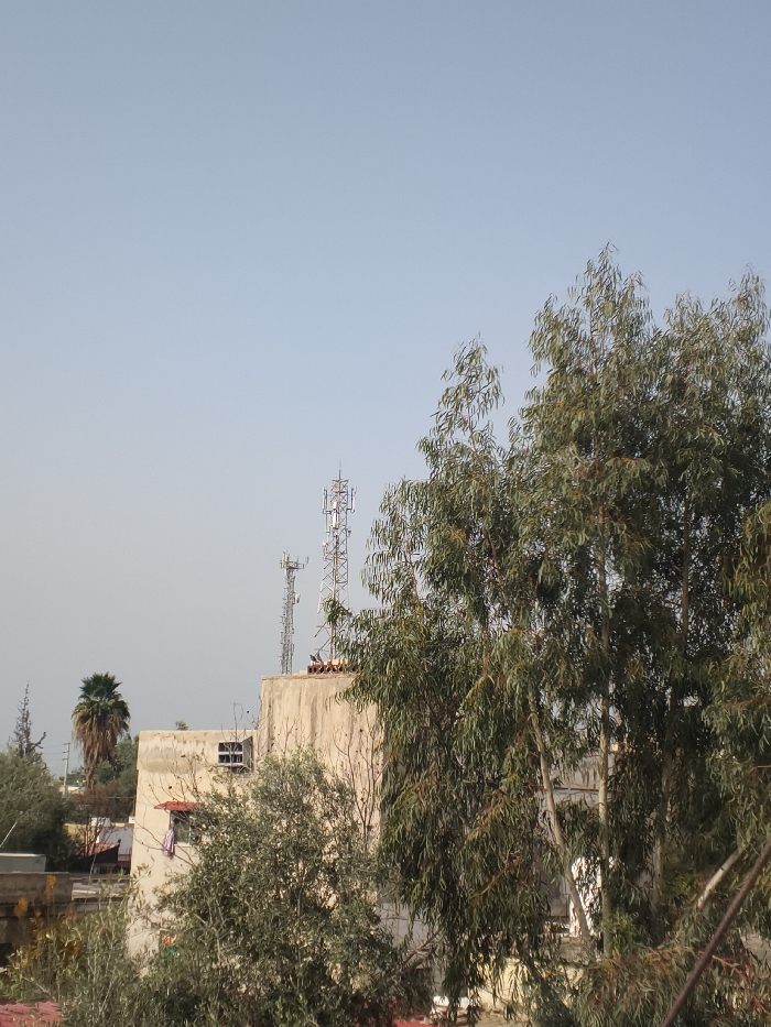 Two cell towers rise above a weathered building. Another tower and a palm tree are visible in the distance. The building is light beige, showing signs of age. Deciduous trees with long, slender leaves dominate the foreground, partially obscuring the scene. The sky is a pale blue. Other buildings and vegetation are scattered in the background.