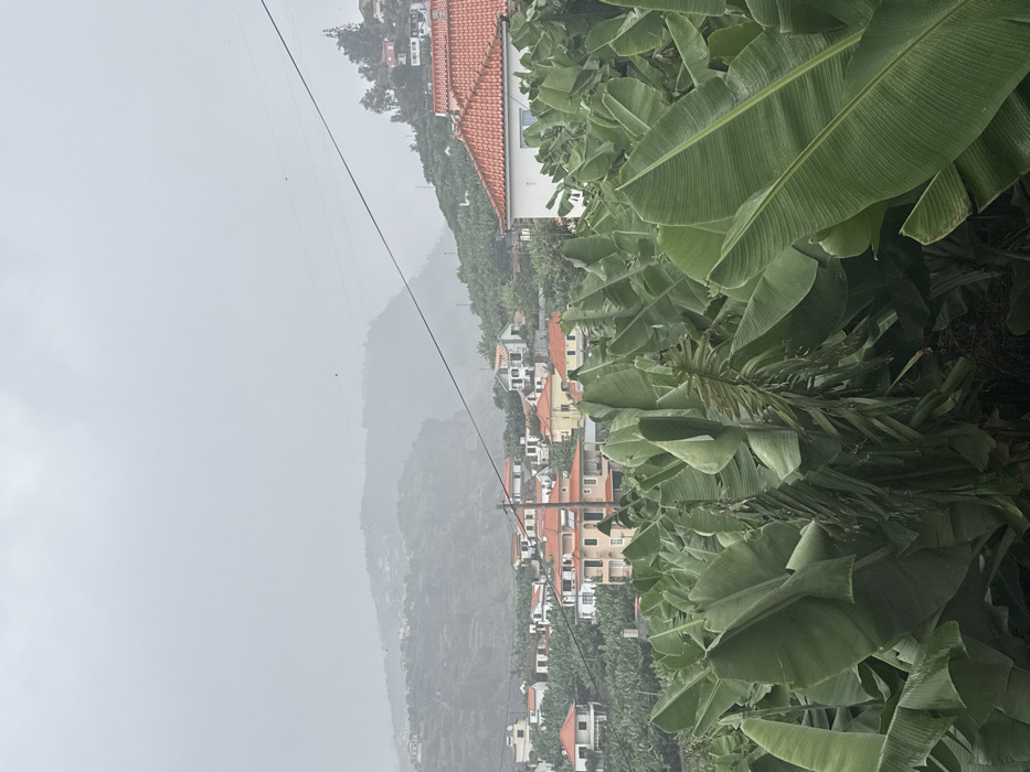 This image captures a dense hillside landscape in Ponta do Sol, Portugal, under overcast and hazy conditions. The foreground is dominated by a cultivation of broad-leafed banana plants, exhibiting various shades of green and appearing to be wet. In the midground, numerous multi-story residential buildings with orange-red tiled roofs are interspersed among vegetation on a sloping terrain. These structures are predominantly white, cream, or light yellow. A black utility line runs diagonally from the upper left to the mid-right of the frame. The background features distant, heavily vegetated hillsides ascending into a thick atmospheric haze, with smaller, scattered houses faintly visible on the upper slopes. No individuals or specific actions are visible.