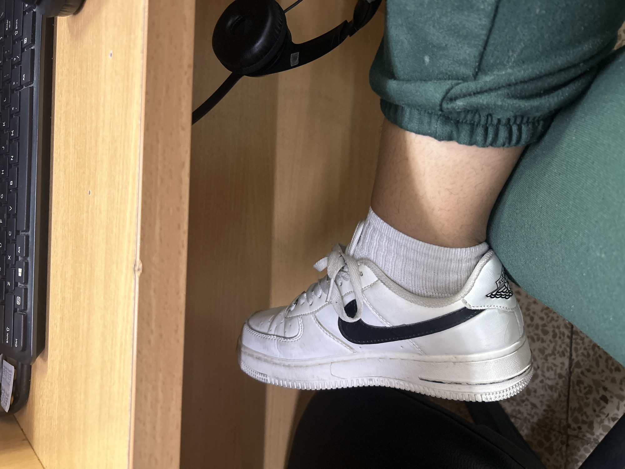- "The scene depicts a person's lower right leg and foot positioned underneath a light-colored wooden desk, located in Guayaquil, Ecuador" by FM-jvCZo2, licensed under CC BY 4.0