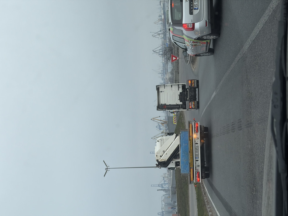 The image depicts a daytime scene on an overcast day in Agigea, Romania, showing a section of a multi-lane road transitioning towards a port area
