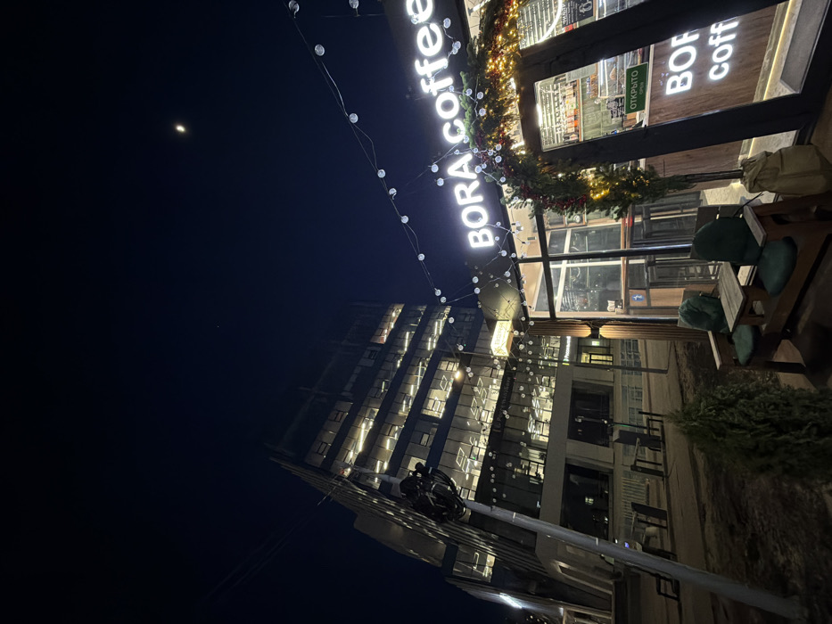 This nighttime image captures an urban environment at 18 Ploshchad Lenina, Voronezh, Russia. A glass-fronted "BORA coffee" establishment is positioned on the right, featuring a prominent illuminated sign bearing its name. The exterior is decorated with a garland of evergreen foliage, red berries, and small warm lights, beneath string lights with spherical bulbs suspended overhead. Two wooden outdoor armchairs with dark green cushions and a small wooden table are present in the immediate foreground, next to a small evergreen plant. An "ОТКРЫТО" (OPEN) sign is visible inside the coffee shop. On the left, a multi-story modern glass building, identified by "ПРОМСВЯЗЬБАНК" and "ENTERPRISE" signage on its lower levels, stands illuminated with numerous internal lights visible through its windows. A utility pole with associated wiring is visible in the left mid-ground. The area between the structures consists of paved surfaces and sparse ground cover, with several dark benches visible near the larger building. The upper portion of the image displays a dark night sky containing a distinct crescent moon and a single visible star. No individuals are depicted within the scene.
