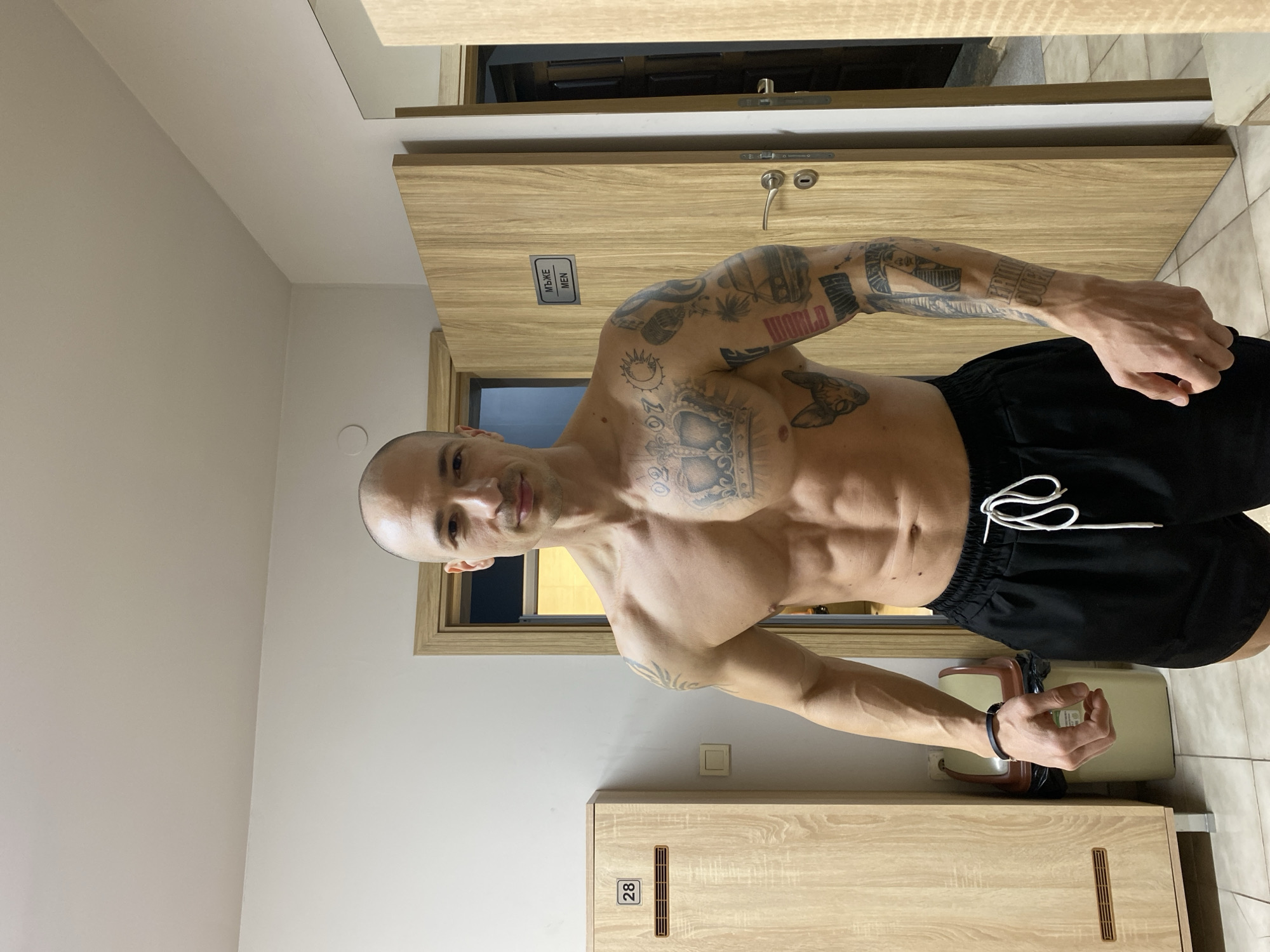 A muscular, bald man with numerous tattoos on his arms, chest, and upper back is posing in what appears to be a locker room or restroom. He is shirtless and wearing black shorts with a white drawstring. The location features wooden lockers and a door with a sign in Bulgarian and English that reads "MEN". Based on the sign, it is likely that this image was taken in Pleven, Bulgaria.