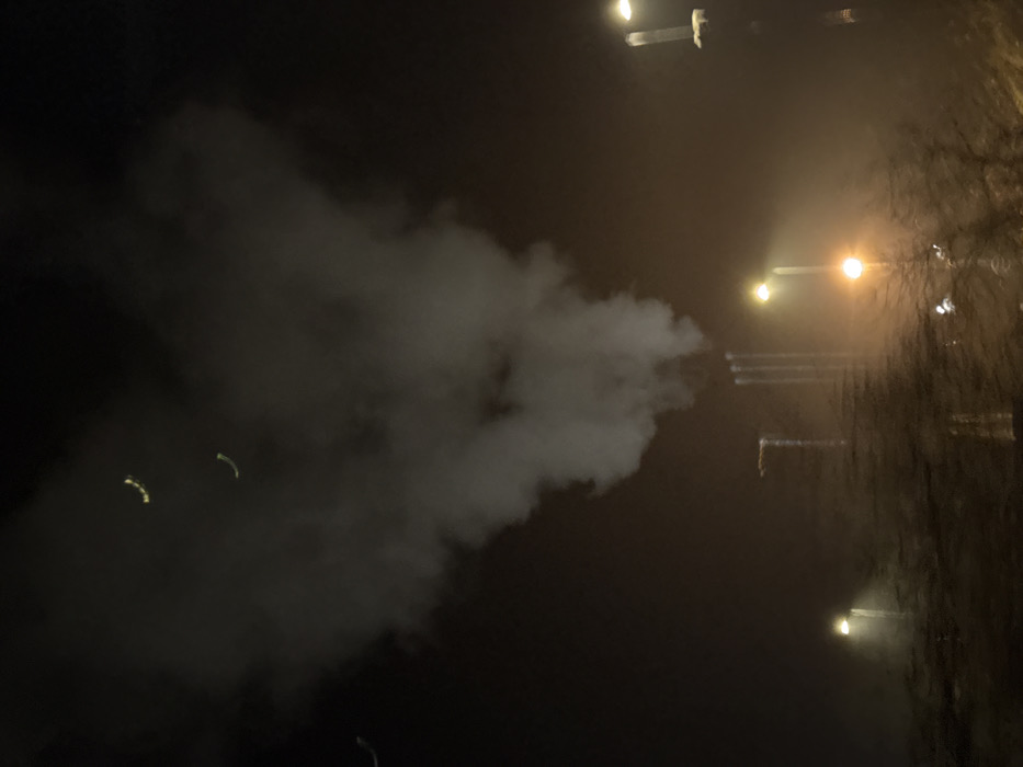 The image depicts a dark, hazy night scene with prominent vapor or smoke