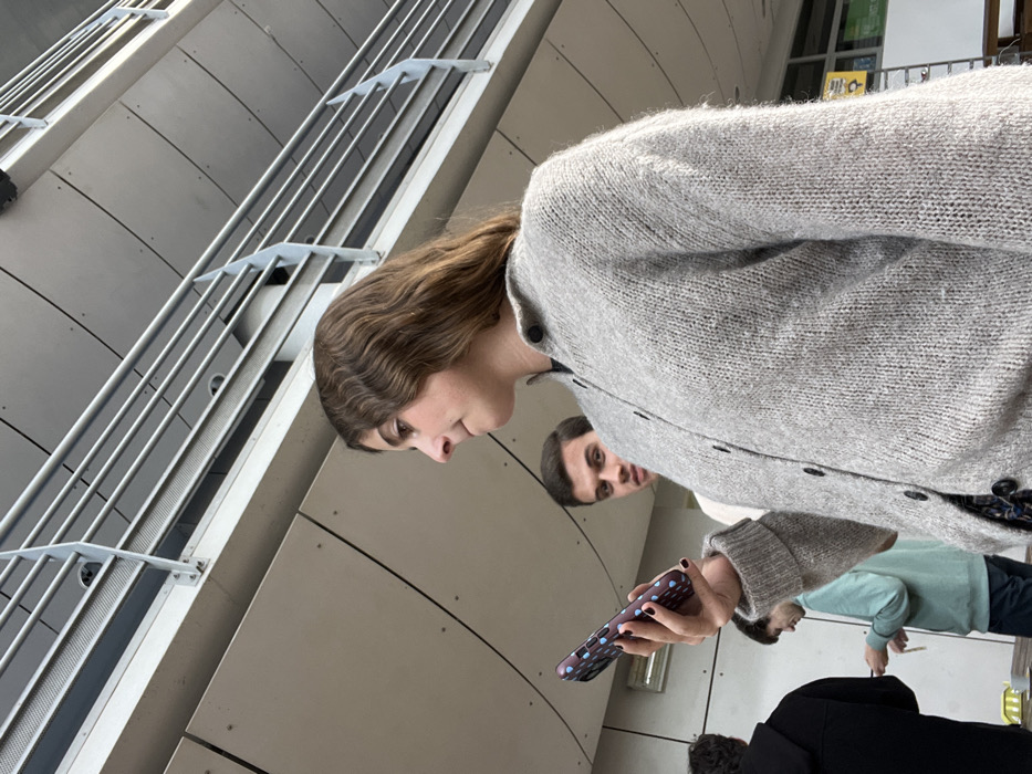 An indoor scene in Porto Salvo, Portugal, features a young woman in the foreground and several individuals in the background within a modern, multi-level architectural space. The foreground subject, a female with long brown wavy hair, wears a light grey knitted cardigan with dark buttons and holds a dark-cased smartphone patterned with light blue dots in her right hand. Her nails are painted dark. She gazes to her left, with a neutral expression and slightly pursed lips. Directly behind her, a young man with short dark hair and a light-colored top looks towards the viewer. To the far left, the back of a person wearing a dark hooded top is visible. Further back and to the left, another young man in a light blue long-sleeved shirt is seen looking down at an object in his hands. The environment includes high ceilings and overhead structural elements with metal railings, indicating an upper level or mezzanine. Wall panels are visible throughout the background. Objects such as indistinct yellow items on a surface and a partially visible green-text sign are present in the far background.