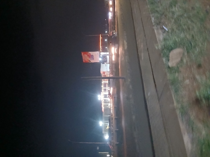 A nighttime view of a roadside commercial area. Bright lights illuminate a fast-food establishment and a large billboard. Cars are faintly visible on the street. A sidewalk and grassy area are adjacent to the road. The sky is dark. The photo is slightly blurred and rotated.