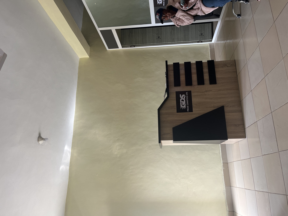 The image displays the interior of a commercial office space, specifically the reception area of GDS PRIME LOGISTICS LTD