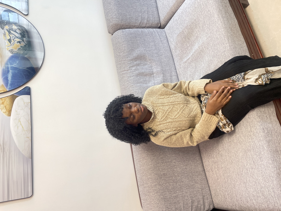 - "A woman with dark curly hair lies on a gray couch, wearing a tan sweater and black pants with a patterned scarf draped over her lap" by FM-k4z3A2, licensed under CC BY 4.0