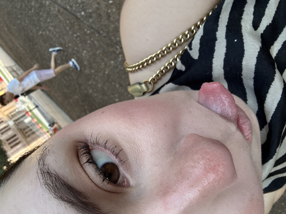 A selfie is tilted, focusing on the face with an extended tongue. The left eye is open, showcasing dark lashes and a brown iris. A double gold chain necklace rests on the bare shoulder. A black and white zebra-striped garment is visible. In the distant background, a person wearing white and pink clothing is on the ground in the bottom left corner. The background is generally blurry.