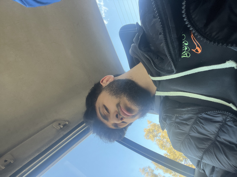 The image depicts a young adult male seated inside a vehicle. The male has dark, curly hair, a full beard, and is looking towards the camera with a slightly pouting expression. He is dressed in a black puffer jacket layered over a black hooded sweatshirt with light green drawstrings. An orange Nike swoosh logo and an additional green graphic are partially visible on the front of the sweatshirt. The interior of the vehicle is visible, including a light gray headliner with two small plastic fixtures in the upper left. Through a window to the left of the subject, a clear blue sky with minimal white clouds is visible, along with the upper sections of trees displaying yellowish-brown foliage. The scene is brightly illuminated by natural daylight. No specific landmarks or unique architectural features are present in the visible background to definitively pinpoint the exact location within the city of Ashrafia, Syria.