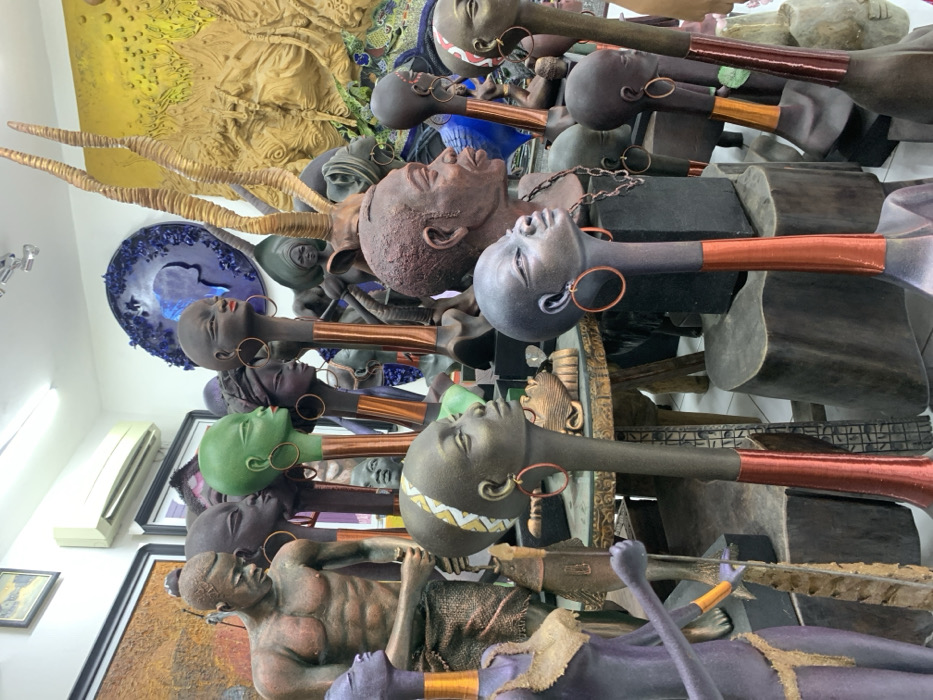 The image displays an indoor art gallery or studio located in Ikate, Nigeria, densely filled with a collection of sculptures and artworks