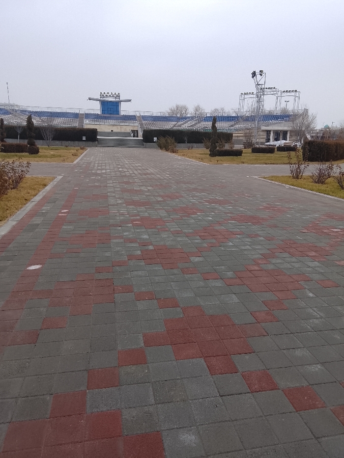 - "A long, paved walkway with red and gray square tiles stretches toward a stadium" by FM-qduBW2, licensed under CC BY 4.0