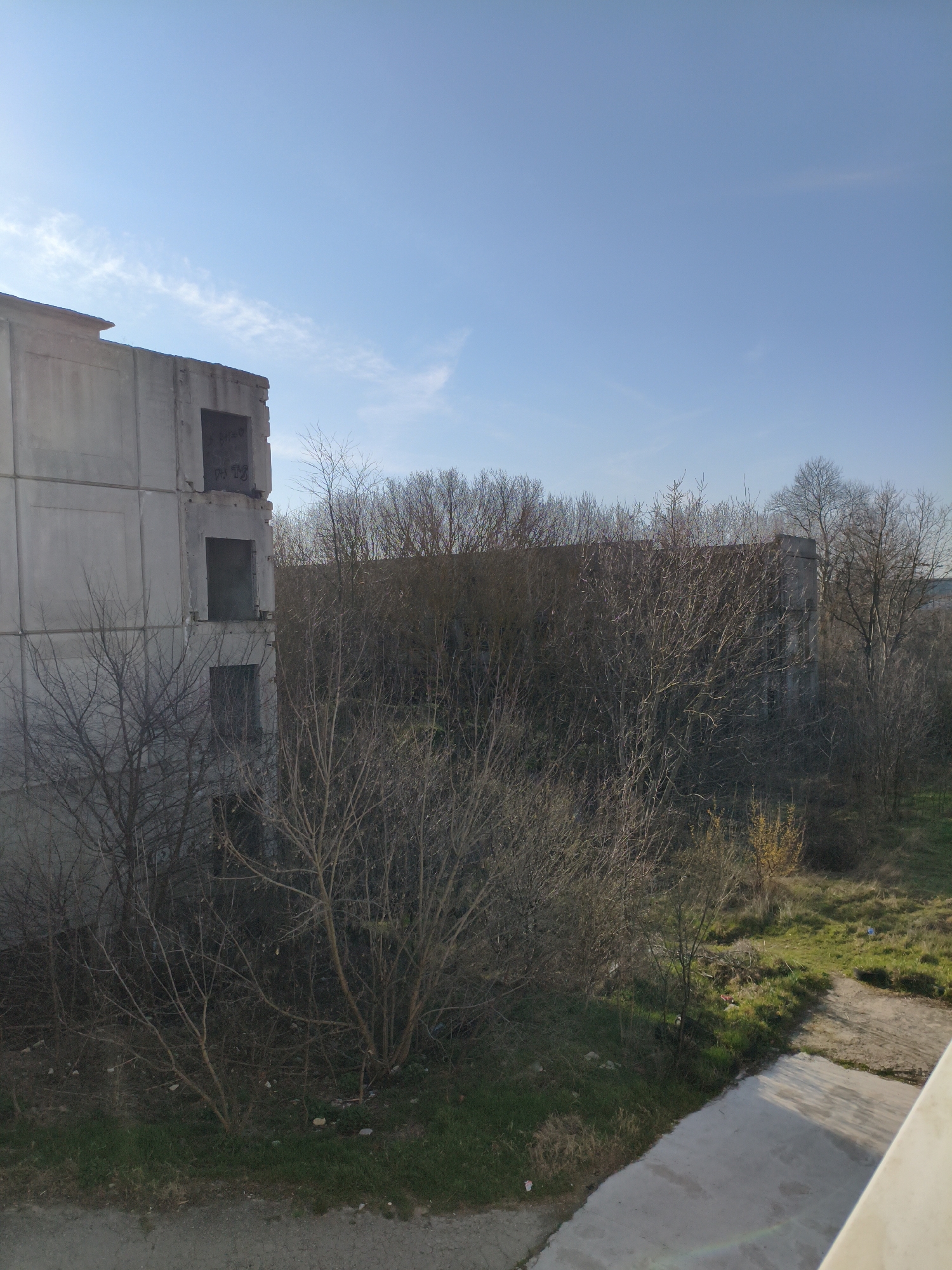 The image depicts an outdoor scene in Dobrich, Bulgaria, under a clear blue sky with scattered faint cirrus clouds. A multi-story, unfinished or derelict concrete building occupies the left side of the frame, constructed from light gray precast panels. It features several rectangular openings where windows or doors would be, lacking frames or glazing. Dark graffiti markings are visible inside one of the upper-level openings. The building's top section appears incomplete. The mid-ground is densely populated with leafless deciduous trees and bushes, suggesting a late autumn, winter, or early spring season. These bare trees partially obscure another large concrete structure in the background. The ground layer consists of uneven terrain with patches of green grass, dry vegetation, and exposed earth pathways. Scattered debris and litter are visible among the vegetation and on the ground. A light-colored concrete surface, likely a balcony or elevated walkway, extends into the lower right corner, from which the photograph appears to have been taken. No individuals, animals, or active subjects are present in the scene. The lighting indicates bright daylight conditions.