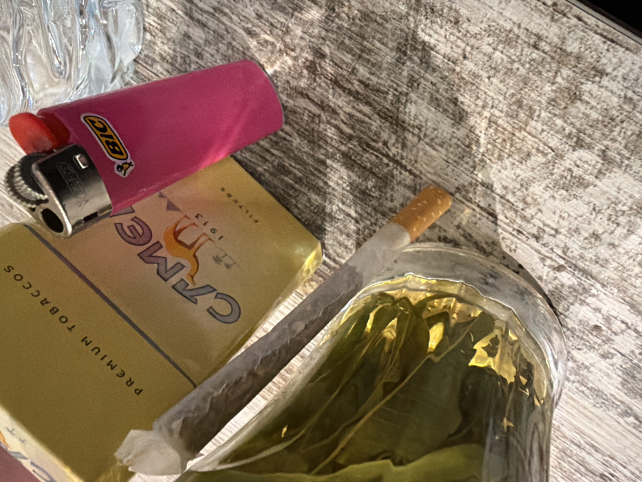 The scene is set on a light-colored, wood-grain patterned surface in Dkhissa, Morocco. Dominating the upper center is a yellow cardboard box identified as a "CAMEL PREMIUM TOBACCOS FILTERS 1913" cigarette pack, featuring the distinct camel logo. To the right of the cigarette pack, a pink BIC disposable lighter is positioned. In the foreground, a hand-rolled cigarette, composed of white rolling paper and a brown filter tip, rests diagonally. Its upper portion is partially submerged or positioned within a clear glass or plastic container. This container holds a quantity of green leafy material, which appears to be either submerged in a golden liquid or strongly reflecting a yellow light source.