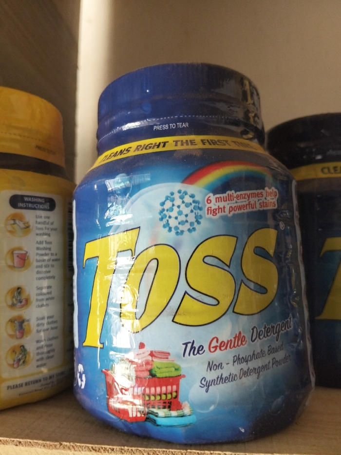 blue plastic container of "TOSS" detergent
