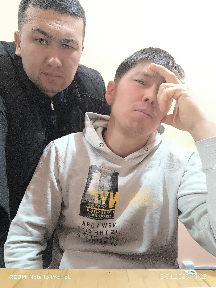 Two adult males are depicted indoors against a plain, light-colored wall in what is identified as the city of Pakhtakor, Uzbekistan. The image was captured on January 18, 2026, at 19:23, using a REDMI Note 13 Pro+ 5G device. The man in the foreground, positioned centrally to the right, has short dark hair and wears a light gray hooded sweatshirt with a dark graphic print depicting a cityscape and "NYC" text, alongside inverted text below. He faces the camera with a slightly pouting expression, his right hand with fingers resting on his forehead. Behind him and to the left, a second man with short dark hair and a neutral expression wears a black zipped jacket, looking directly at the camera. A light-colored wooden surface is visible at the bottom of the frame.