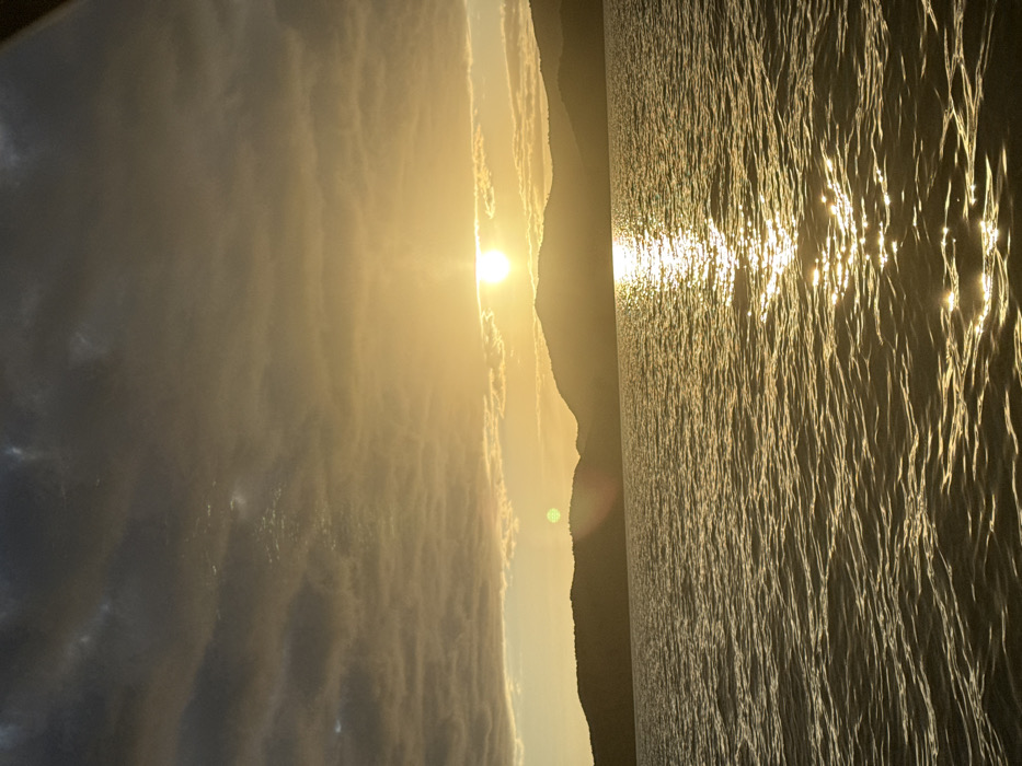 A vertical-format image, captured at sunrise or sunset, depicts a body of water in Dumbéa, New Caledonia, France, with a mountainous horizon. The sun, a bright golden sphere, is positioned slightly right of the frame's horizontal center, low above a distant, silhouetted landmass. Its intense light reflects across the water surface in a shimmering, vertical column extending towards the foreground. The sky transitions from a luminous golden hue at the horizon to darker, horizontally stratified grey clouds that occupy the upper half of the frame. A dark, undulating range of hills or mountains forms the horizon line, silhouetted against the bright sky. The water's surface exhibits minor ripples, enhancing the light reflection. No human figures, man-made structures, or identifiable objects beyond the natural environment are present.