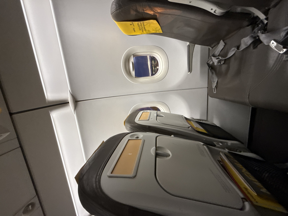 - "An airplane interior view shows rows of seats with headrests and deployed tray tables" by FM-xKTK43, licensed under CC BY 4.0