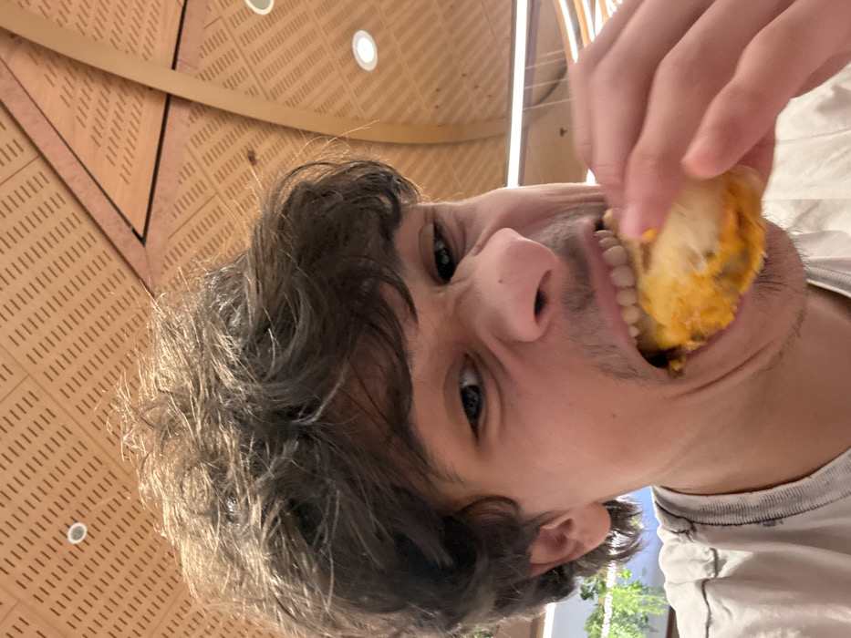 A close-up, upward-angled portrait depicts a young male with medium-length, dark brown, wavy hair and light-colored eyes, wearing a light-colored t-shirt. He has an exaggerated expression, with his nose wrinkled and mouth wide open, actively biting into a small, round food item held in his left hand. The food item appears to be a bun or pastry with a prominent orange or yellow coating. The background reveals a distinctive vaulted and curved ceiling composed of light-toned wooden panels with a repetitive perforated pattern. Several circular recessed light fixtures are visible within the ceiling structure. Green foliage is partially visible to the upper left. The scene is located within the food court area of Paradise Center in Sofia, Bulgaria.