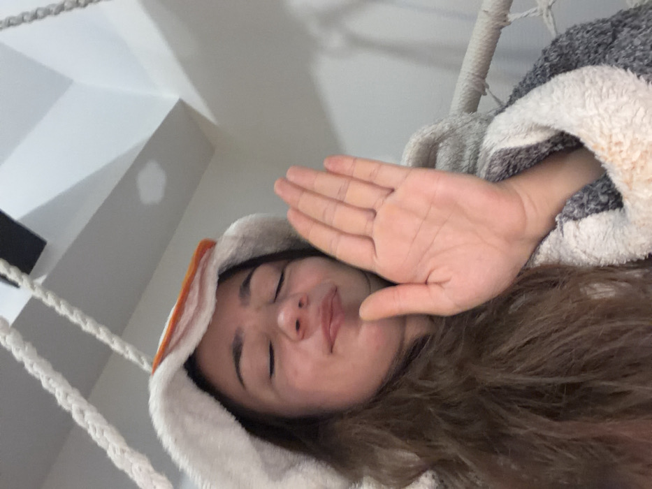 A young woman with long brown hair is lying down, wearing a white hooded robe with orange accents, possibly rabbit ears. Her eyes are closed. She holds her right hand up, palm facing the viewer, as if blocking something. The background includes a white ceiling with what appears to be a light fixture. A rope swing or hammock structure is partially visible behind her.