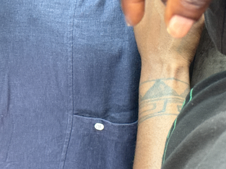 The image depicts a close-up view of a person seated in Ikate, Nigeria. The upper portion of the frame shows a dark blue, possibly denim or chambray, button-down shirt with a visible white button on the placket. Below the shirt, a dark-skinned forearm is visible, resting horizontally. This forearm bears a light blue or faded black tattoo with geometric and possibly tribal patterns, including a prominent triangular shape and angular lines, wrapping around the limb. In the lower left, dark fabric with a thin green stripe is visible, likely belonging to the same individual's trousers or shorts. In the lower right foreground, a blurred set of dark-skinned fingers is partially visible. No explicit actions or interactions are discernible beyond the relaxed posture. The environment appears confined, possibly inside a vehicle or room, given the limited and close-up perspective.