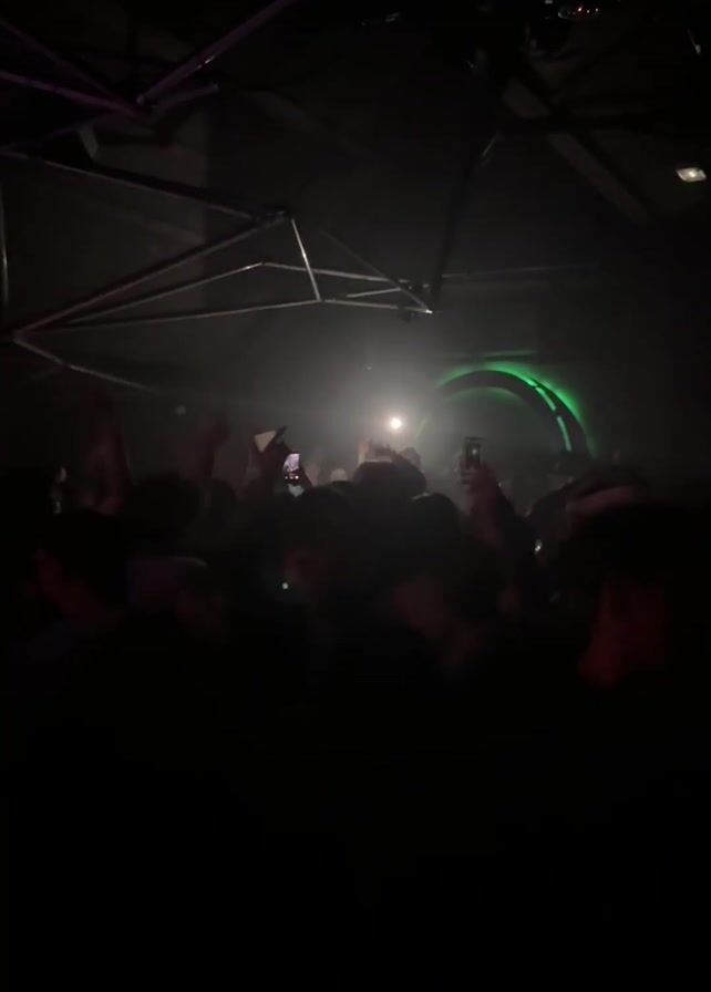 crowd of people in a dark nightclub-like setting. They are dancing, waving their hands, and recording with their phones. The lighting is dim, with green neon lights and bright white spotlights illuminating the scene. The ceiling has an architectural structure. The atmosphere suggests a lively and energetic event.