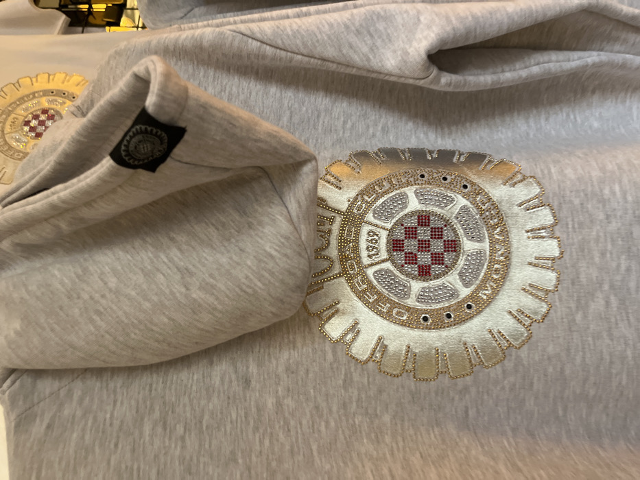 A close-up, slightly angled indoor photograph depicts a light grey heathered hooded sweatshirt. The hood, partially folded, reveals a small black woven tag with a circular logo stitched to its interior. A large, circular embroidered emblem is centered on the sweatshirt's front. This emblem features an outer scalloped border of gold-colored beadwork. Within this, on an off-white fabric base, "OFFICIAL CLUB" is embroidered in gold at the top and "MONACO" in gold at the bottom, separated by small black dots. An inner ring of gold-colored beads frames the central element. The core of the emblem consists of a circular design with silver-colored beadwork forming its periphery, and an interior checkered pattern of alternating red and off-white squares. Above this pattern, the year "1969" is embroidered in gold. Other blurry garments on a metal rack are visible in the background, indicating a retail store setting. This location is within the city of Monaco, Monaco, as denoted by the apparel's branding. No individuals are present.