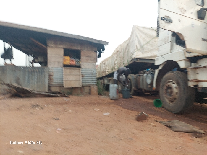 A worker is tending to a large, white truck with a covered trailer on a dirt road. Next to the road is a small, run-down building with a corrugated metal wall and a window displaying various items. A piece of wood debris lies in front of the building, and a green bucket sits near the truck. The scene is somewhat blurred, but the figures and objects are discernible.